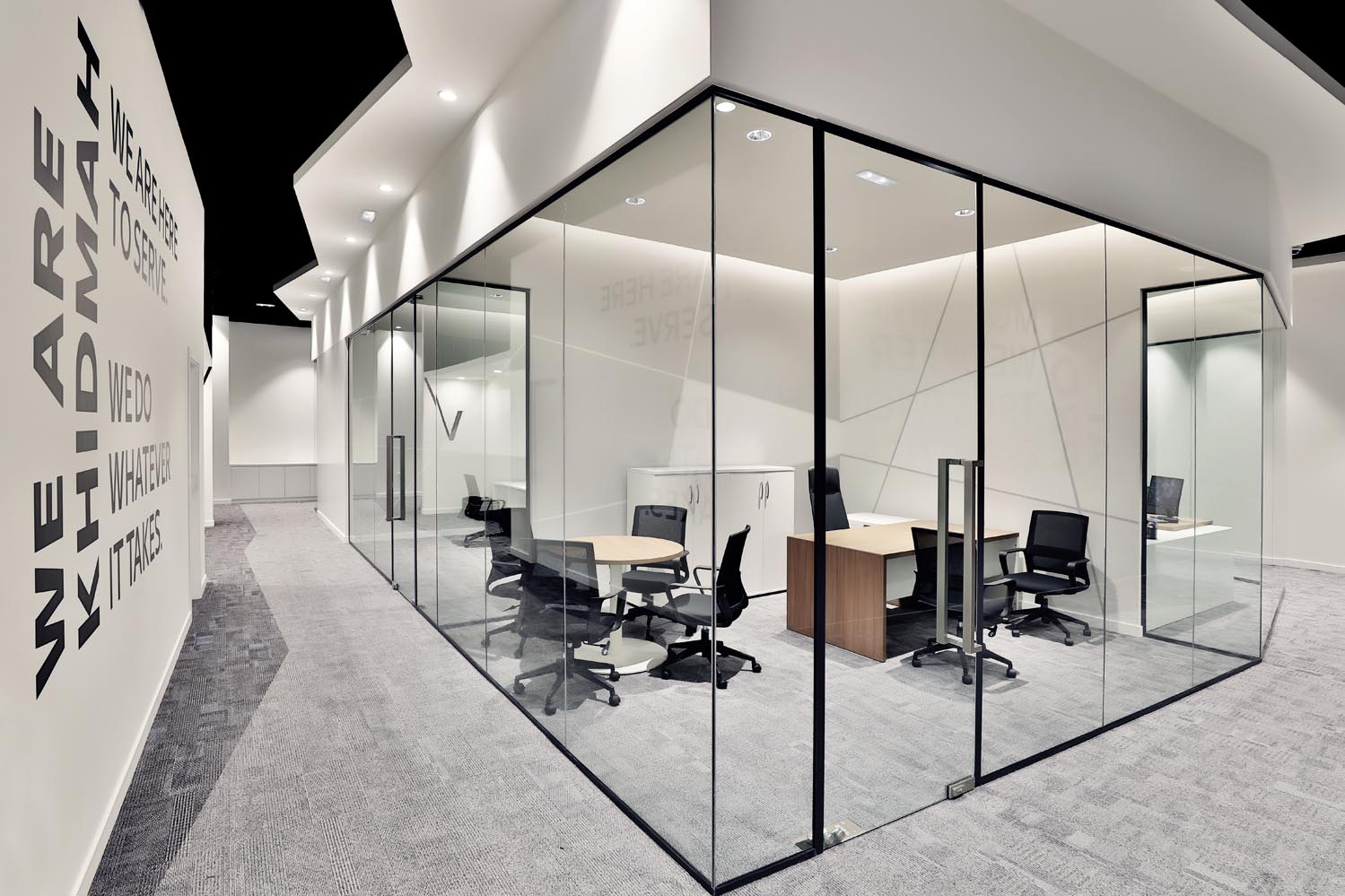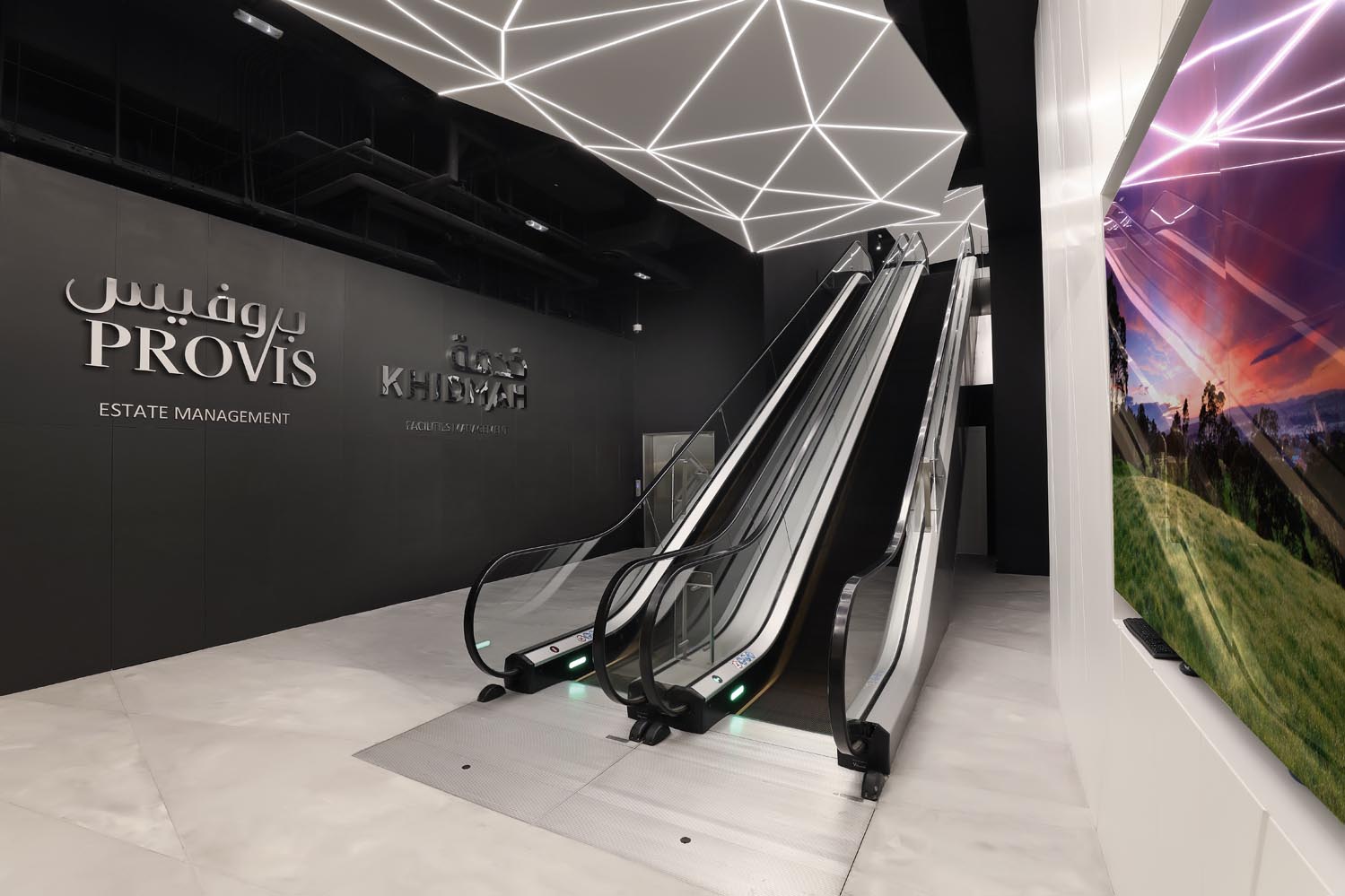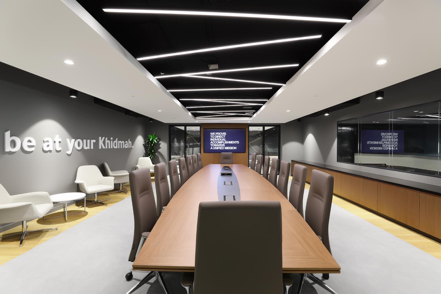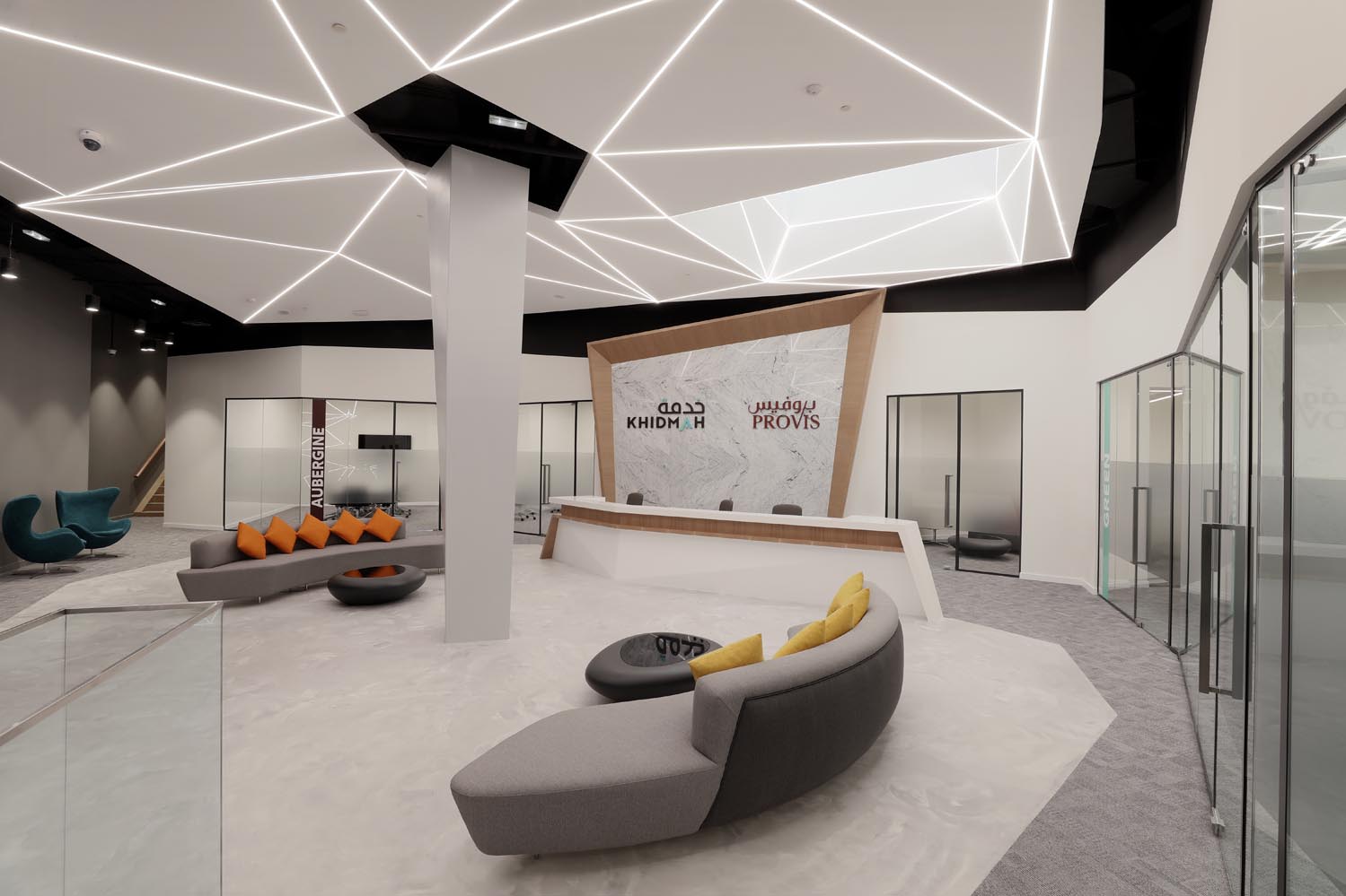 The project consists of the full interior design of the new Khidmah HQ located on the 1st floor of Yas Mall, Abu Dhabi. The unit extends on three levels, with the main entrance at 1st floor (shop front), the main space at 2nd floor (reachable by internal escalators and elevator) and the board meeting room on a mezzanine level.