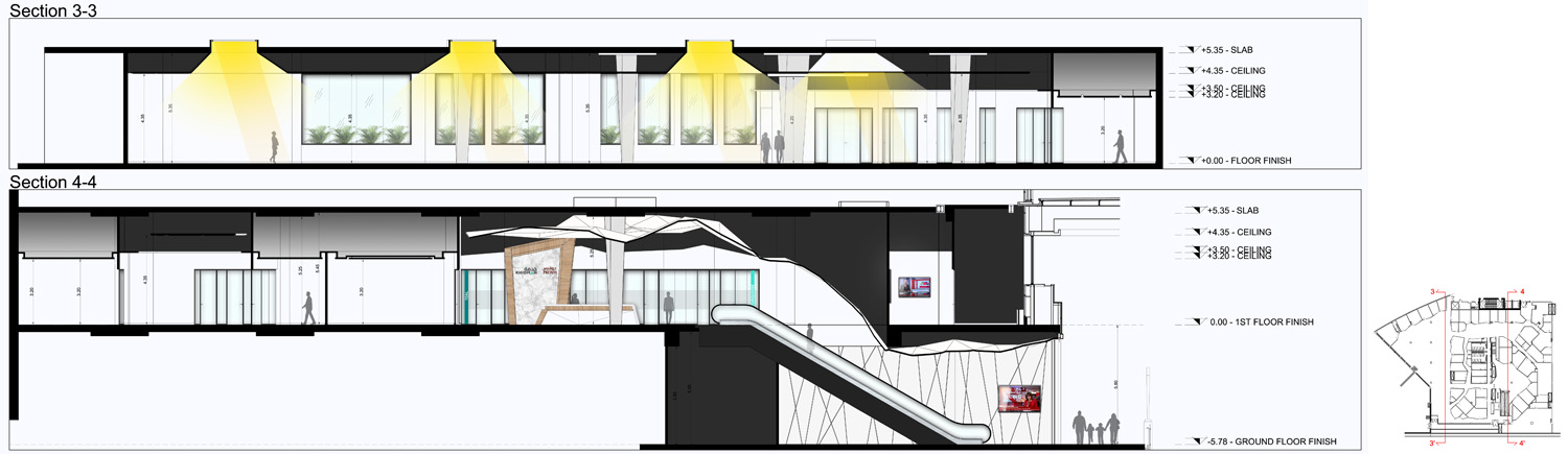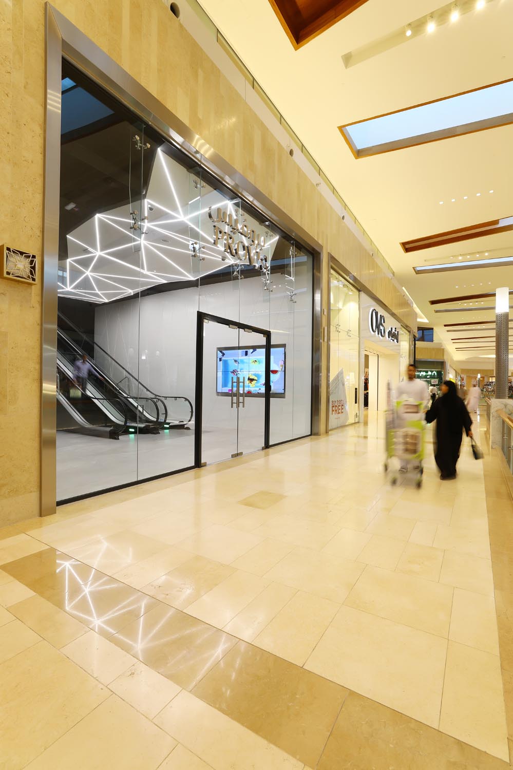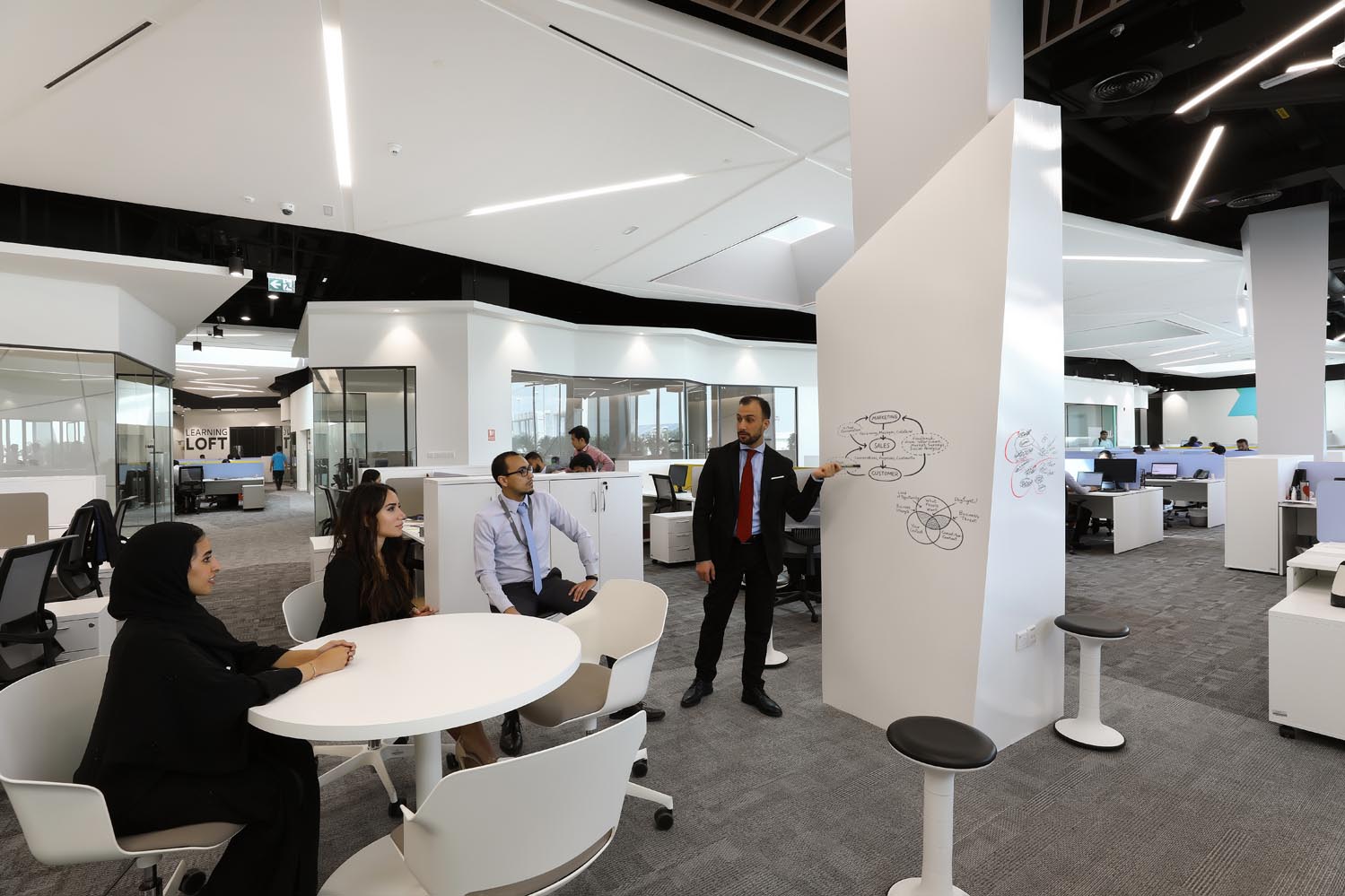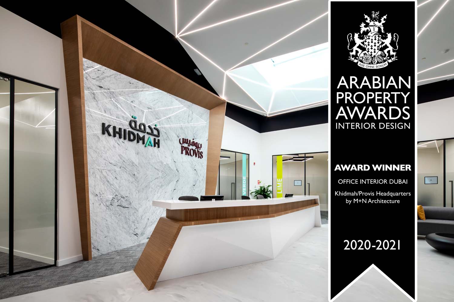The project consists of the full interior design of the new Khidmah HQ located on the 1st floor of Yas Mall, Abu Dhabi. The unit extends on three levels, with the main entrance at 1st floor (shop front), the main space at 2nd floor (reachable by internal escalators and elevator) and the board meeting room on a mezzanine level.