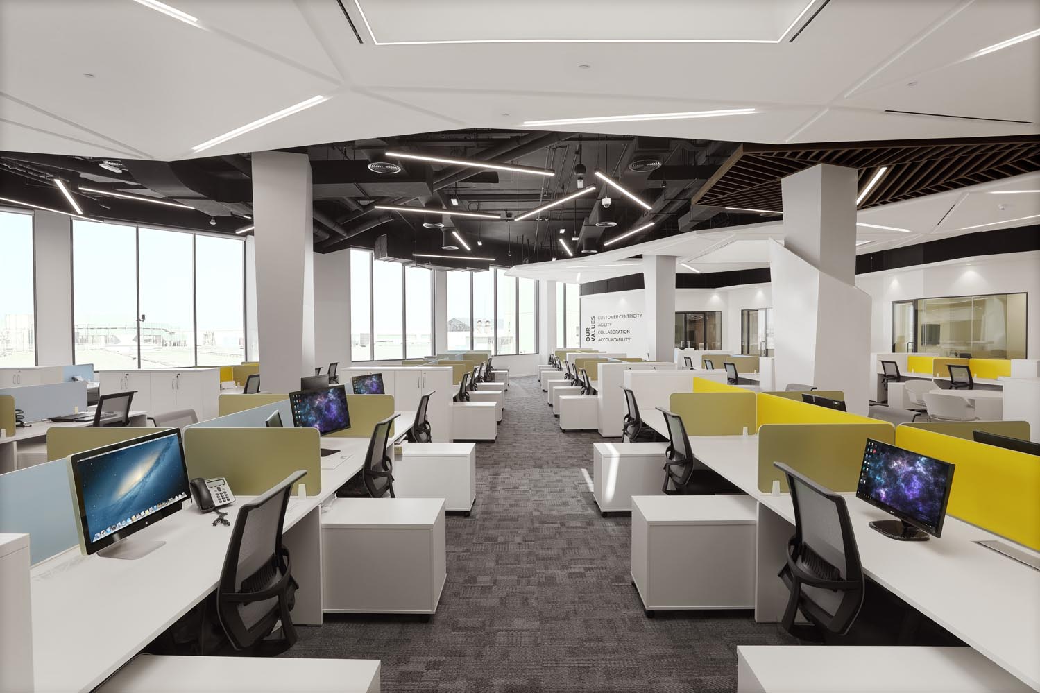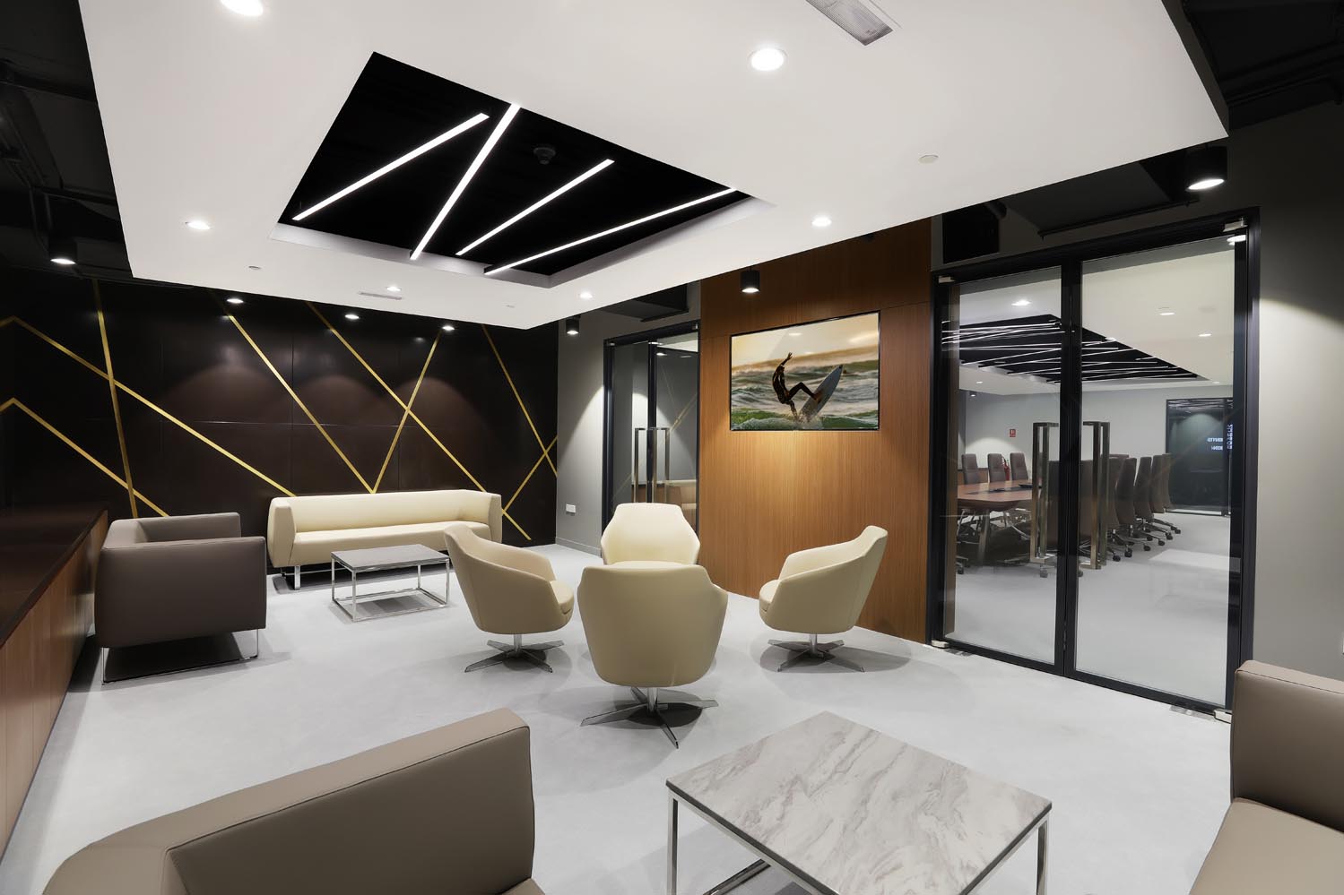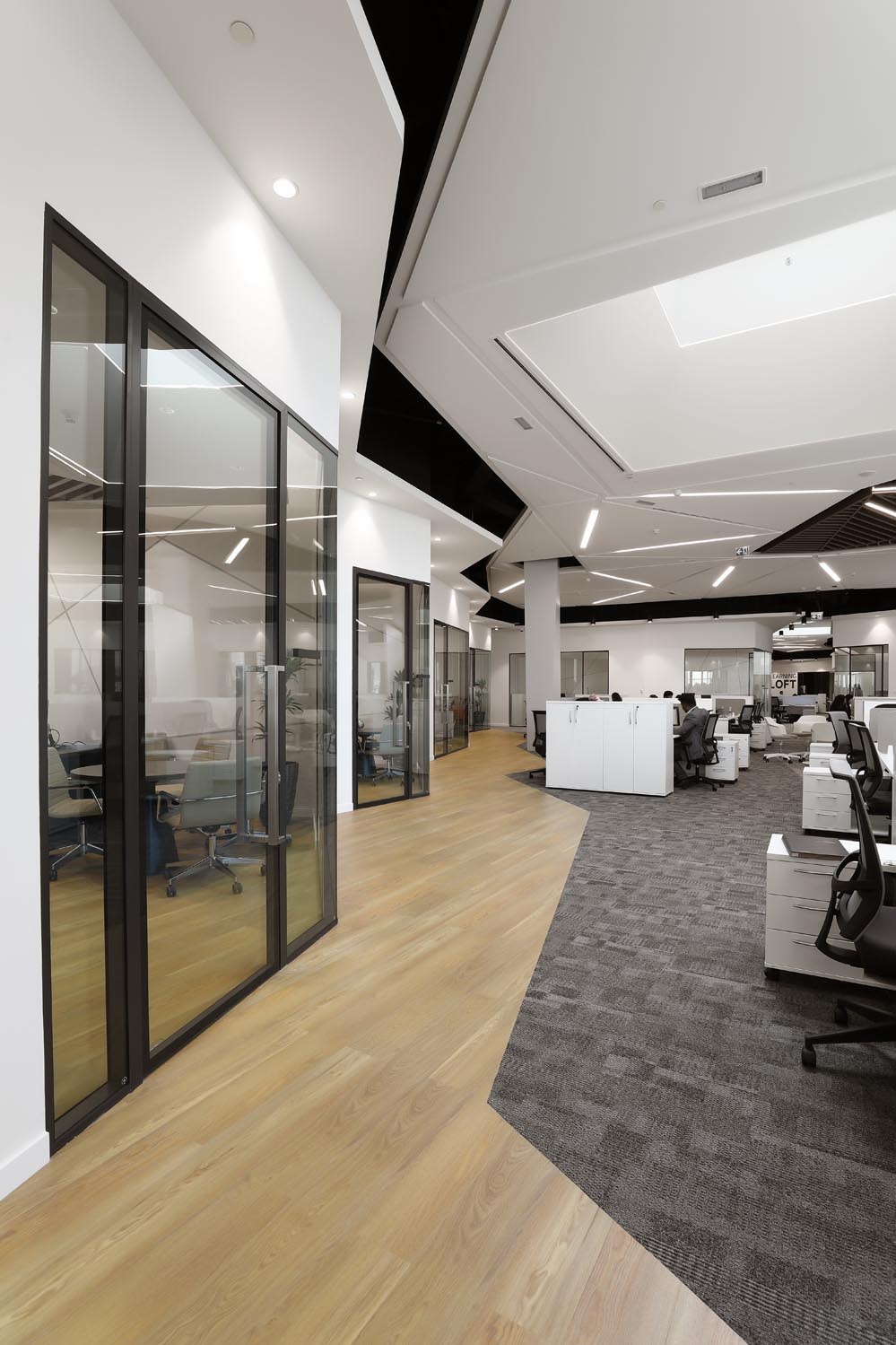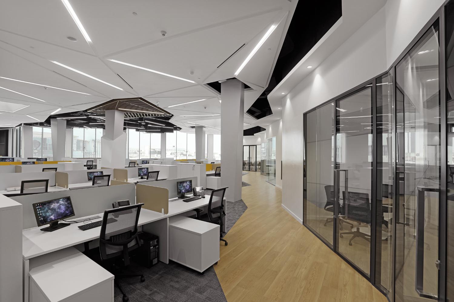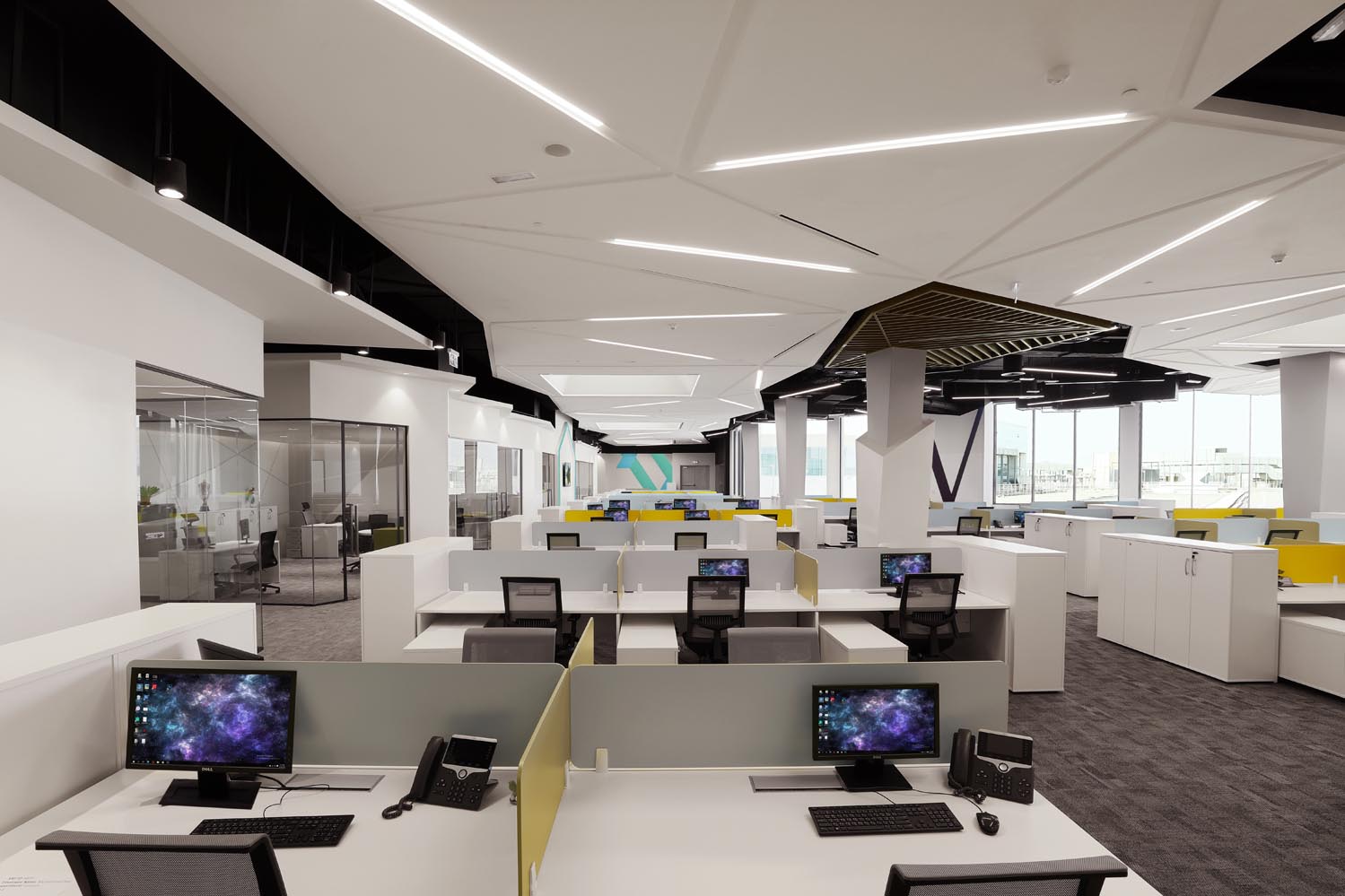 The design makes full use of the exceptional internal height of 5,35 m. and is centered around a series of open spaces which are interconnected by 3D and 2D faceted ceilings. The original, space which was completely windowless, has been radically transformed via a series of spot demolitions which created a new ample glazed facade on the north perimeter of the unit, as well as 7 skylights on the roof which diffuse natural light on the working space below. Project includes open workstations, enclosed offices for managers and dept. heads, C-level suites, CEO office, board meeting room with majilis, 5 meeting rooms, training room, informal meeting spaces, phone booths, call center, break-out area with pantry, server room and storages.