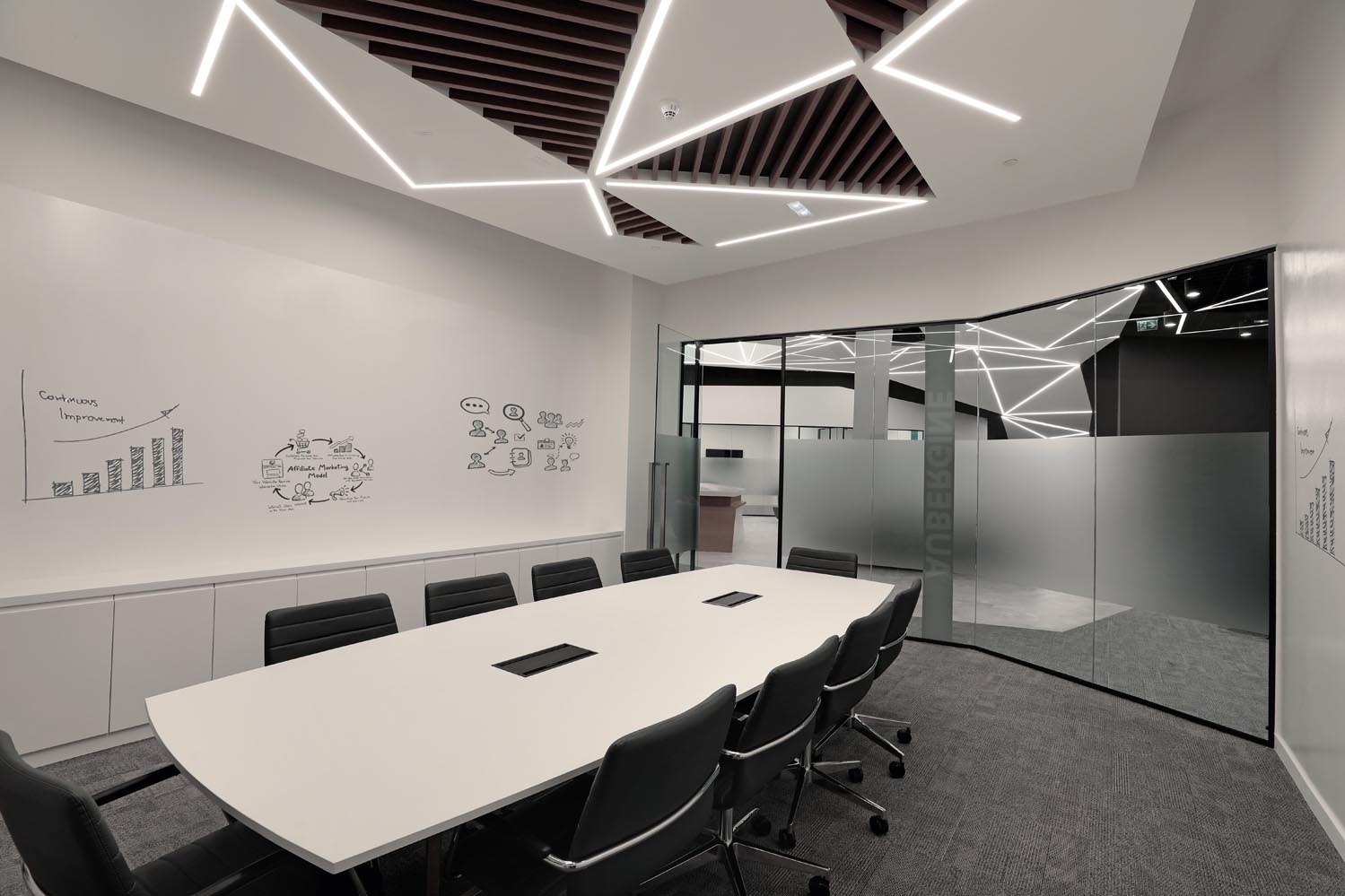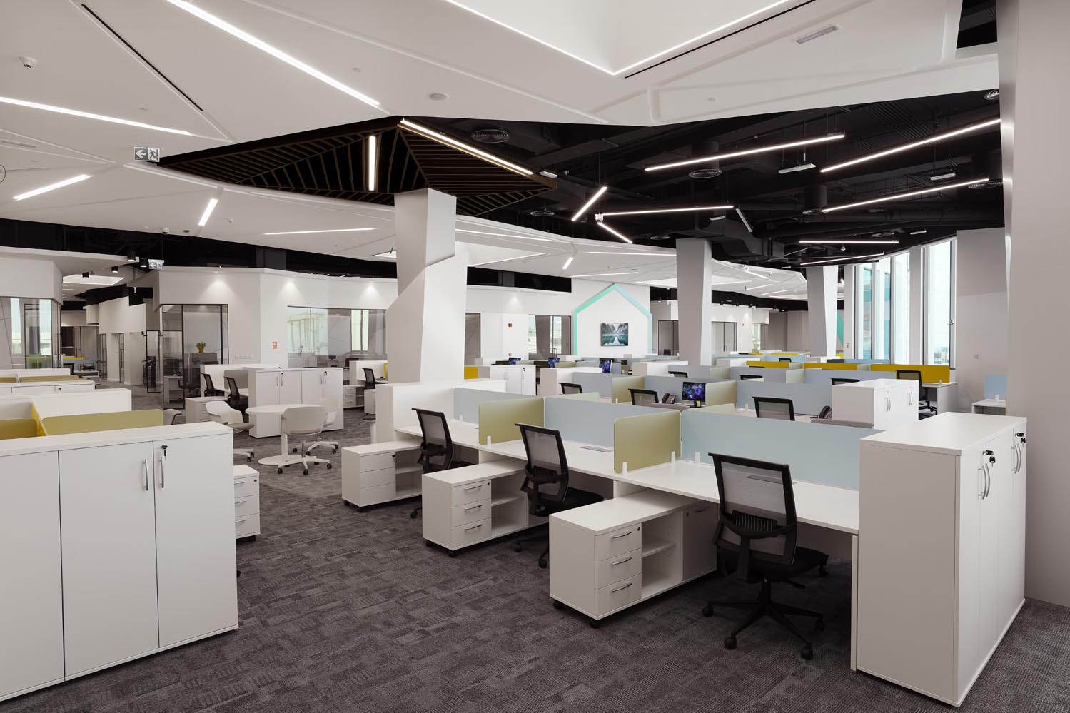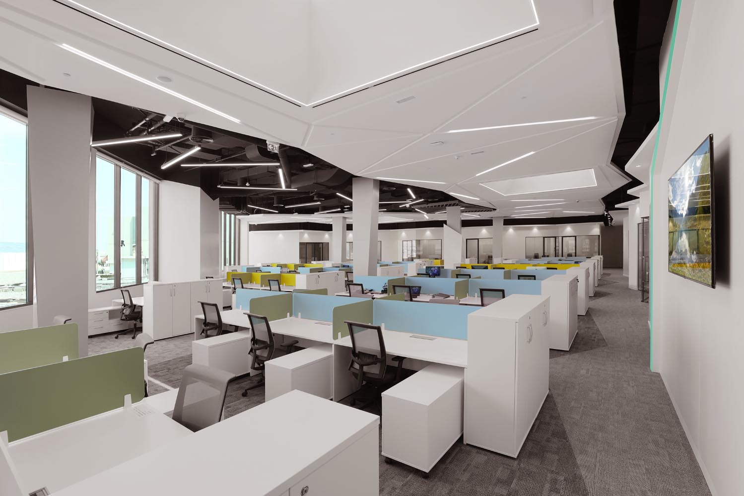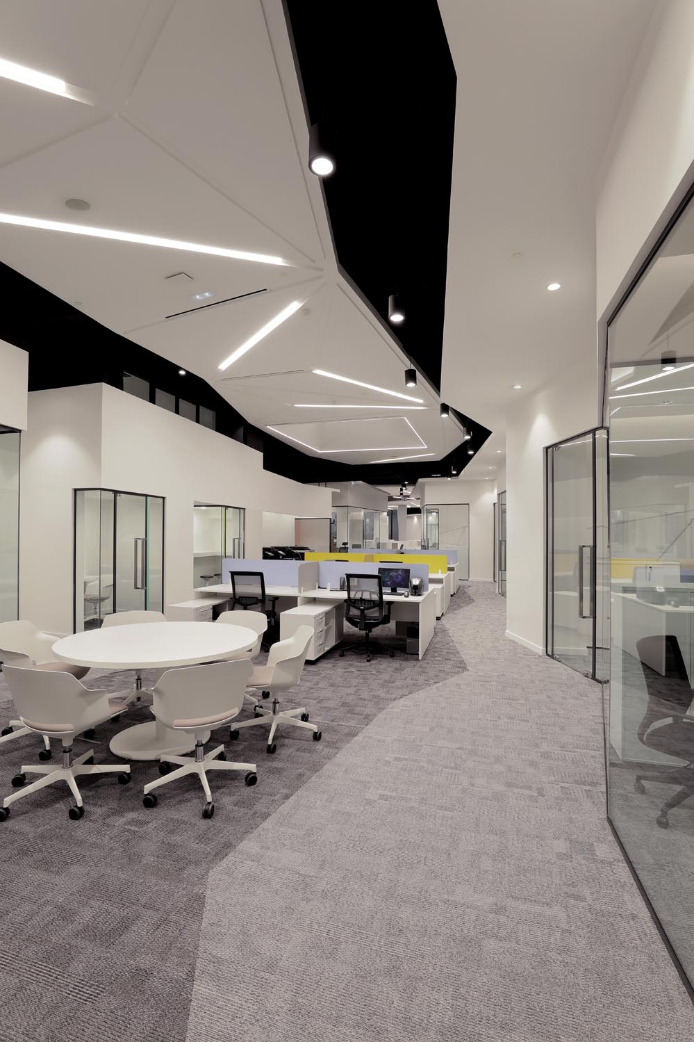 The design makes full use of the exceptional internal height of 5,35 m. and is centered around a series of open spaces which are interconnected by 3D and 2D faceted ceilings. The original, space which was completely windowless, has been radically transformed via a series of spot demolitions which created a new ample glazed facade on the north perimeter of the unit, as well as 7 skylights on the roof which diffuse natural light on the working space below. Project includes open workstations, enclosed offices for managers and dept. heads, C-level suites, CEO office, board meeting room with majilis, 5 meeting rooms, training room, informal meeting spaces, phone booths, call center, break-out area with pantry, server room and storages.