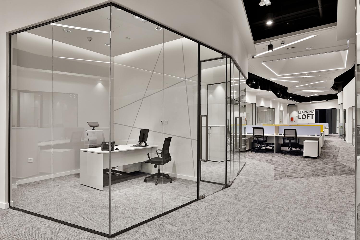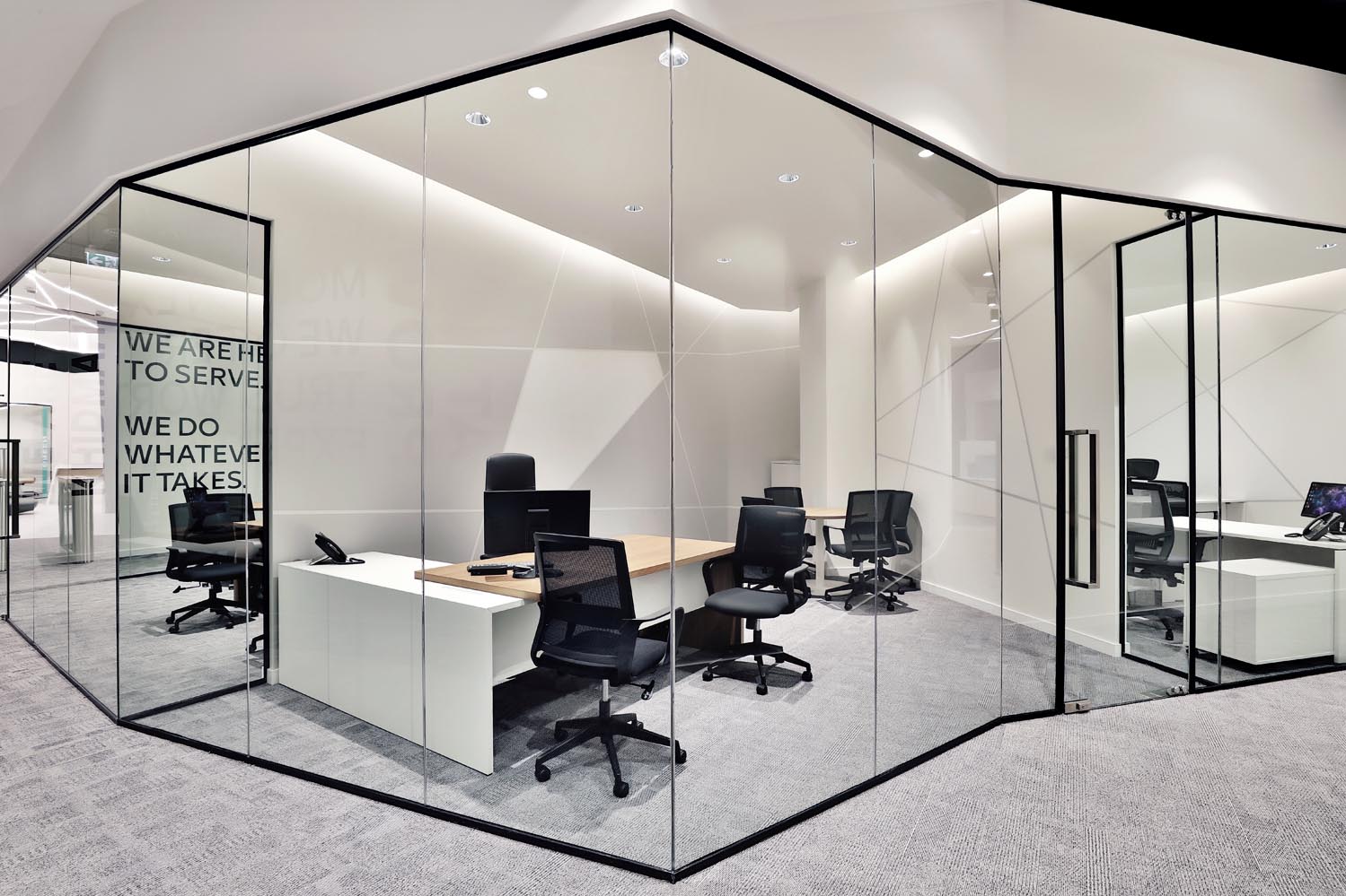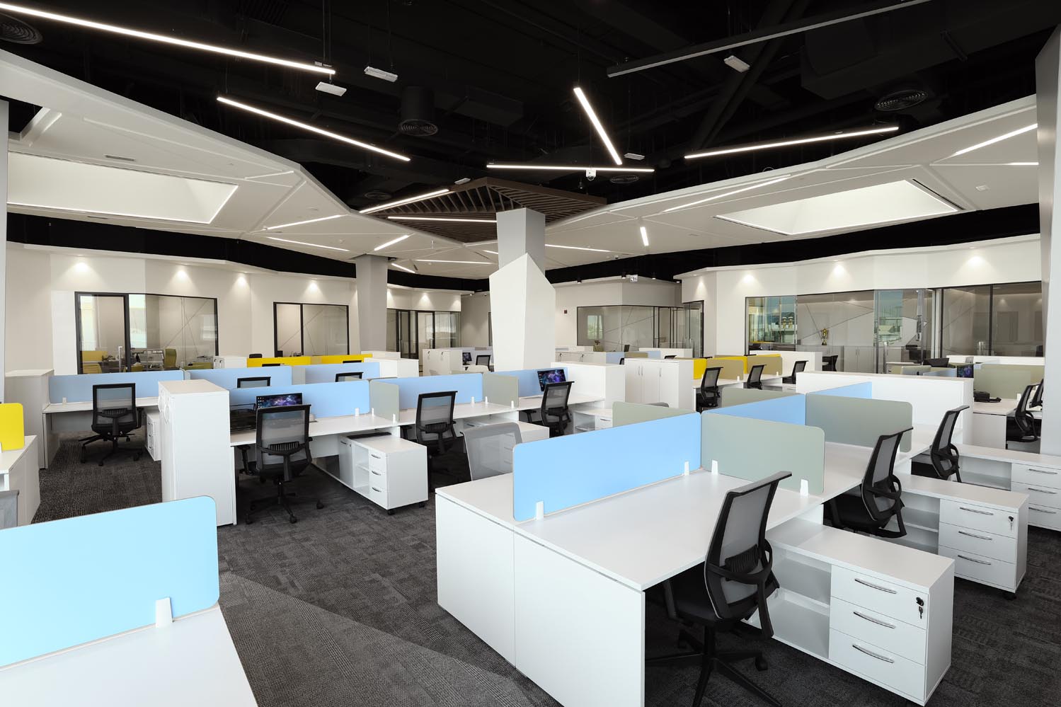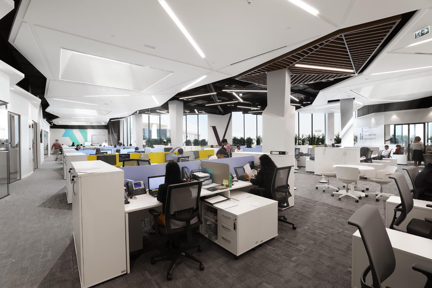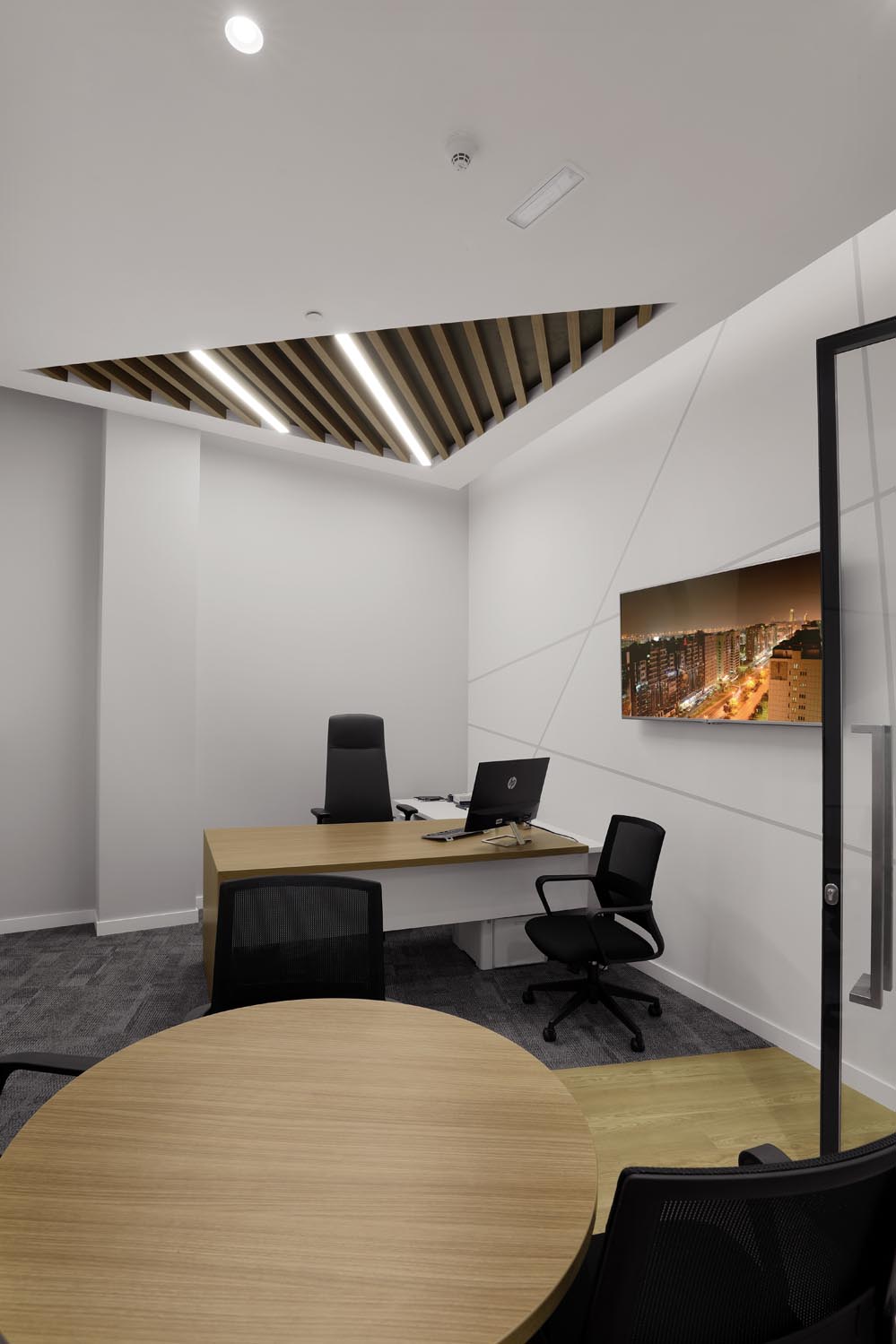 The design makes full use of the exceptional internal height of 5,35 m. and is centered around a series of open spaces which are interconnected by 3D and 2D faceted ceilings. The original, space which was completely windowless, has been radically transformed via a series of spot demolitions which created a new ample glazed facade on the north perimeter of the unit, as well as 7 skylights on the roof which diffuse natural light on the working space below. Project includes open workstations, enclosed offices for managers and dept. heads, C-level suites, CEO office, board meeting room with majilis, 5 meeting rooms, training room, informal meeting spaces, phone booths, call center, break-out area with pantry, server room and storages.