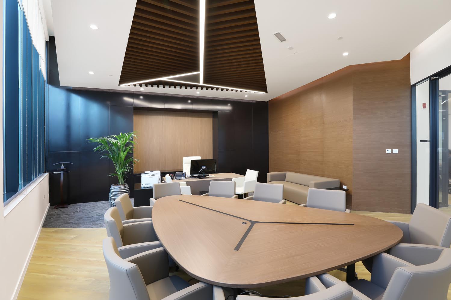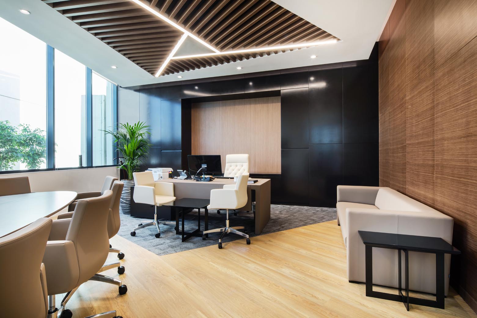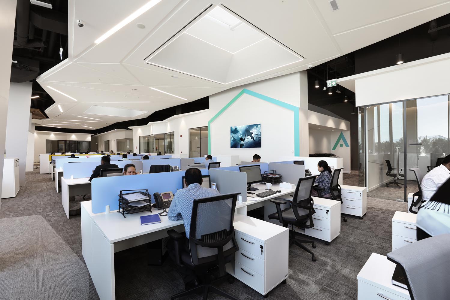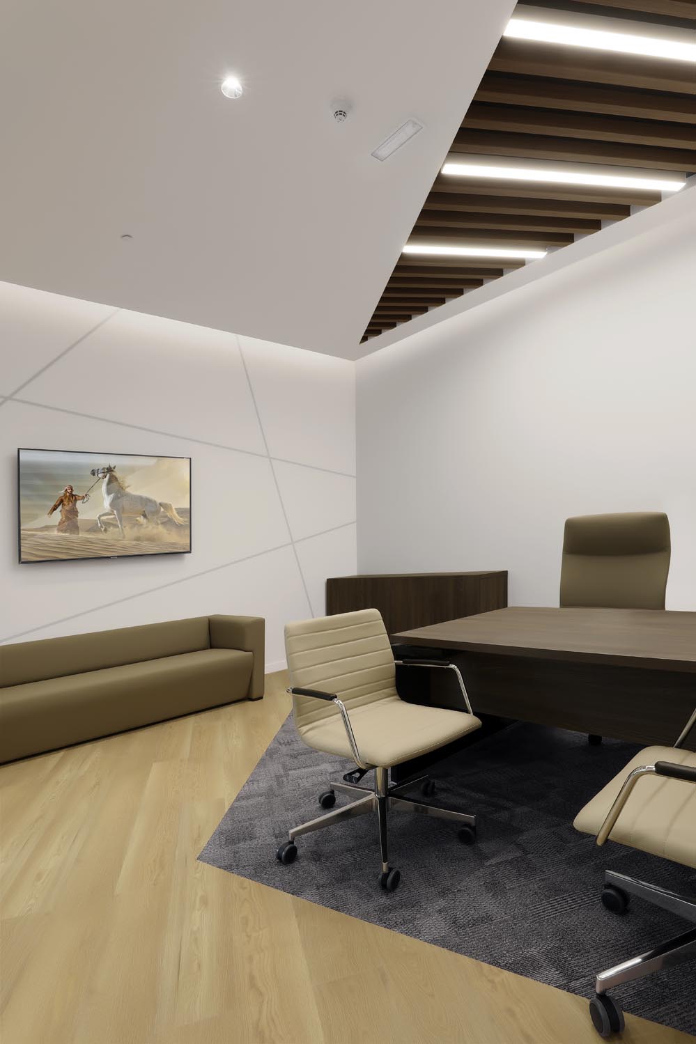 The design makes full use of the exceptional internal height of 5,35 m. and is centered around a series of open spaces which are interconnected by 3D and 2D faceted ceilings. The original, space which was completely windowless, has been radically transformed via a series of spot demolitions which created a new ample glazed facade on the north perimeter of the unit, as well as 7 skylights on the roof which diffuse natural light on the working space below. Project includes open workstations, enclosed offices for managers and dept. heads, C-level suites, CEO office, board meeting room with majilis, 5 meeting rooms, training room, informal meeting spaces, phone booths, call center, break-out area with pantry, server room and storages.