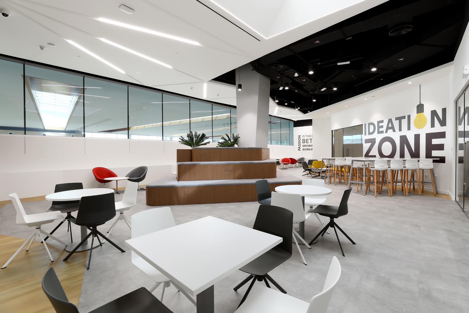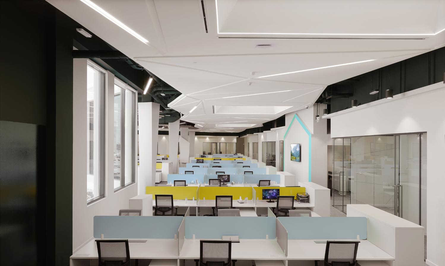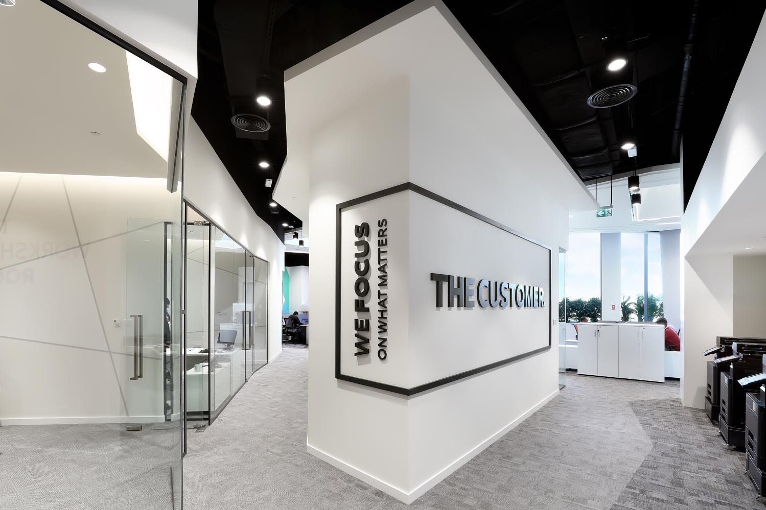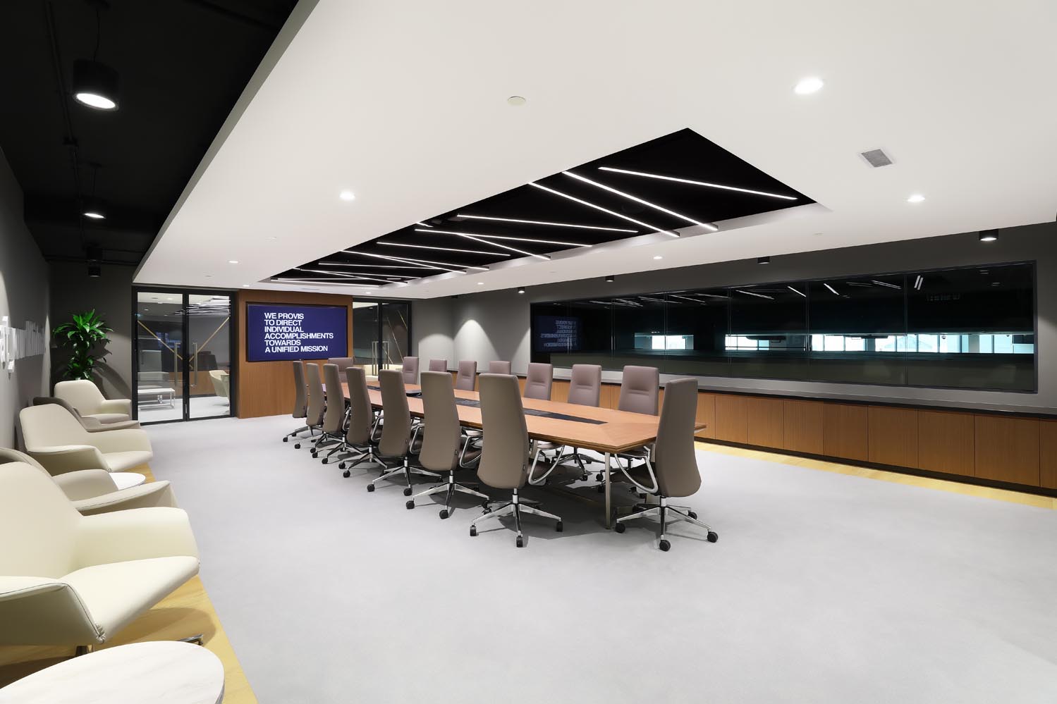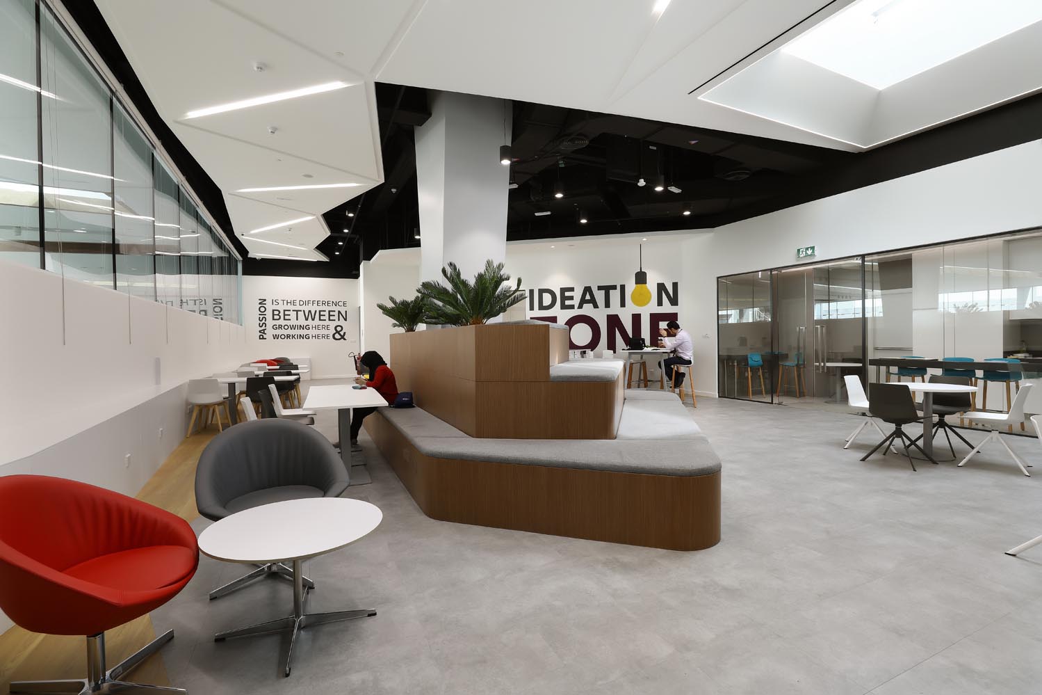The design makes full use of the exceptional internal height of 5,35 m. and is centered around a series of open spaces which are interconnected by 3D and 2D faceted ceilings. The original, space which was completely windowless, has been radically transformed via a series of spot demolitions which created a new ample glazed facade on the north perimeter of the unit, as well as 7 skylights on the roof which diffuse natural light on the working space below. Project includes open workstations, enclosed offices for managers and dept. heads, C-level suites, CEO office, board meeting room with majilis, 5 meeting rooms, training room, informal meeting spaces, phone booths, call center, break-out area with pantry, server room and storages.