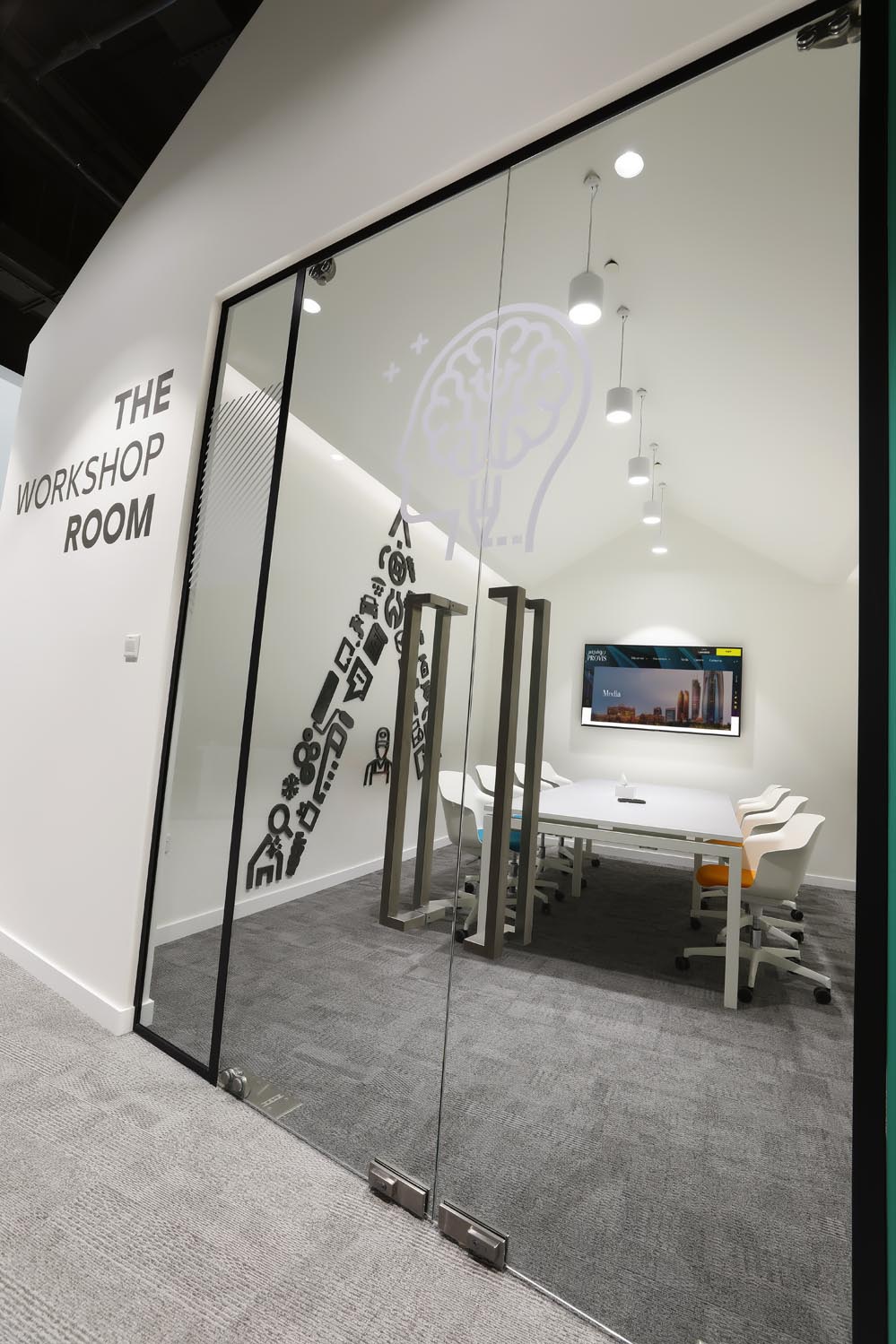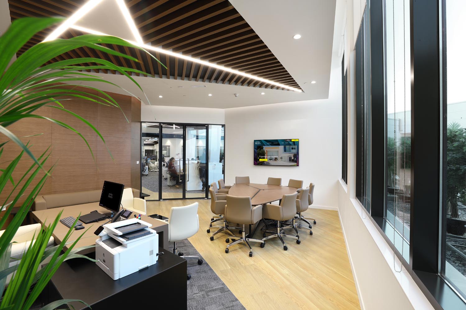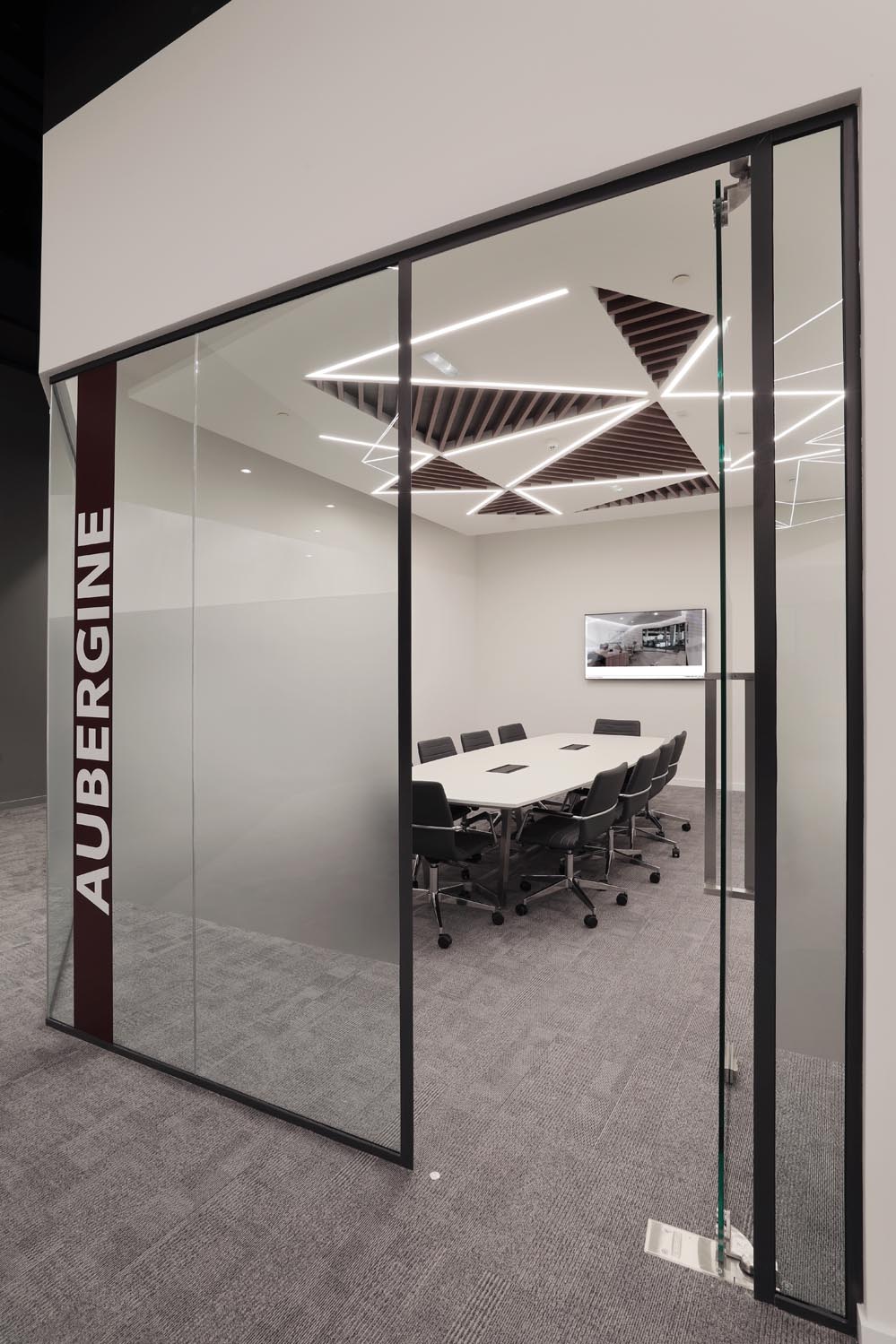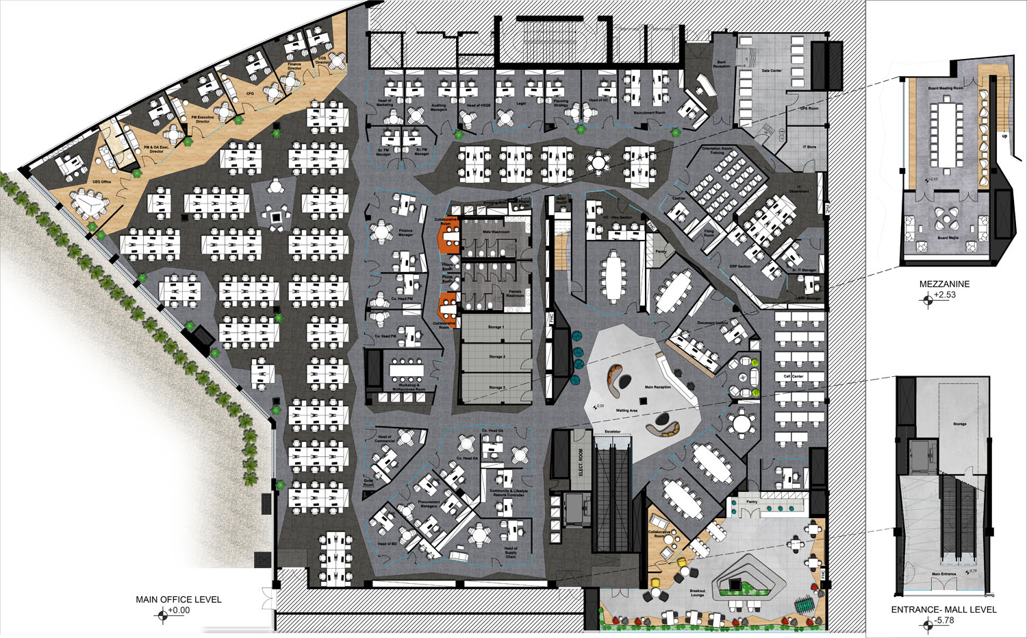 The design makes full use of the exceptional internal height of 5,35 m. and is centered around a series of open spaces which are interconnected by 3D and 2D faceted ceilings. The original, space which was completely windowless, has been radically transformed via a series of spot demolitions which created a new ample glazed facade on the north perimeter of the unit, as well as 7 skylights on the roof which diffuse natural light on the working space below. Project includes open workstations, enclosed offices for managers and dept. heads, C-level suites, CEO office, board meeting room with majilis, 5 meeting rooms, training room, informal meeting spaces, phone booths, call center, break-out area with pantry, server room and storages.